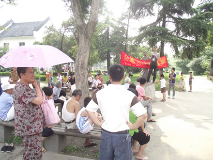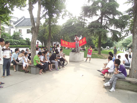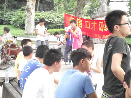 说话不口吃还不行,在公园里进行实践锻炼,有的现场高歌、有的即兴演讲,以各种方式增强心理素质,提高表达能力,用事实证明,口吃变口才不是梦!