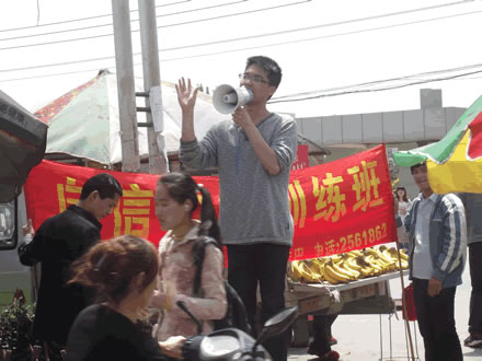 四月份矫正班学员,在阜阳大学门口锻炼当众讲话能力